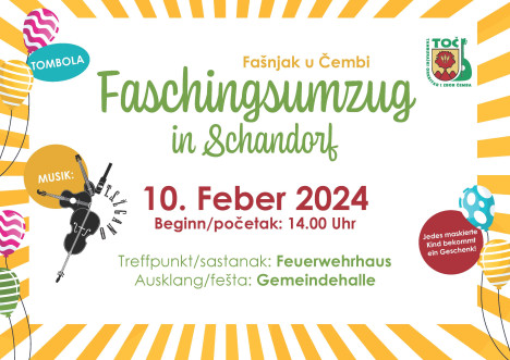 Wir möchten Sie gerne wieder zu unserem traditionellen Faschingsumzug durch Schandorf herzlich einladen. Der gemütliche und vor allem fröhlich heitere Ausklang findet anschließend in der Gemeindehalle statt. Für beste musikalische Stimmung sorgt heuer erstmals die Gruppe "Žgano".