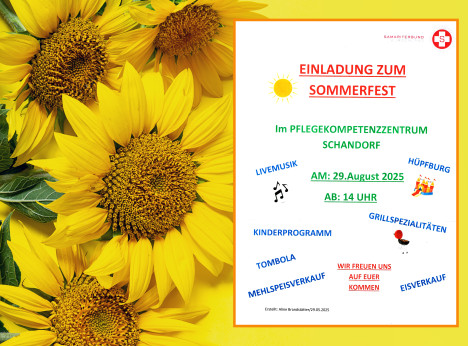Am Freitag, 29. August 2025 findet im dreisprachigen Pflegekompetenzzentrum in Schandorf ein großes Sommerfest mit Livemusik, Hüpfburg, Tombola und Grillerei statt. Beginn ist um 14:00 Uhr.