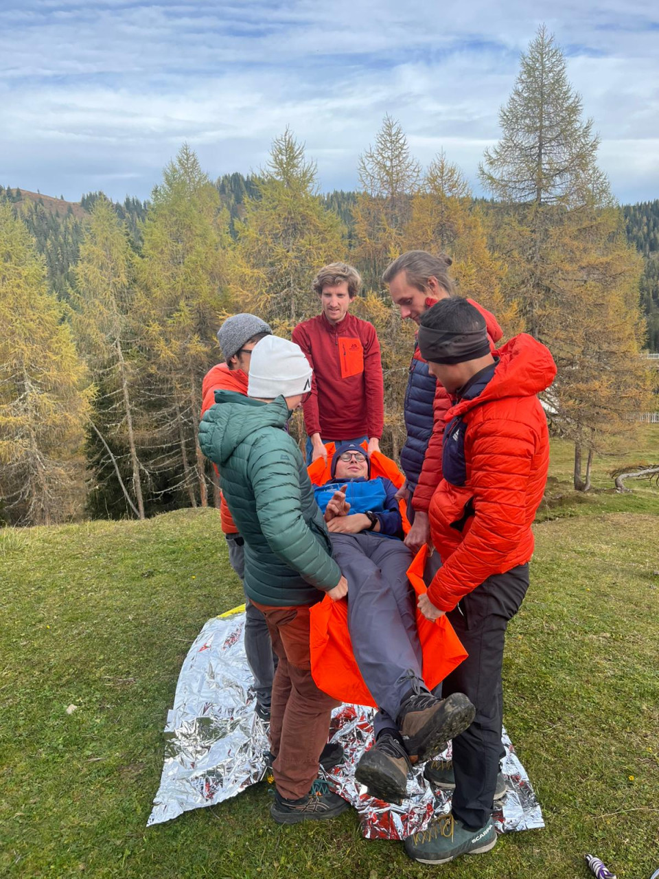 Der zweite Ausbildungstag stand im Zeichen der Alpinmedizin. Unterstützt von Bergführeraspirant, Arzt und ehemaligem Alpinkader-Mitglied Matthias Lampel. Geübt wurden verschiedene Szenarien zum Abtransport verletzter Personen, Wärmeerhalt, das crABCDE Schema sowie praktische Tipps und Tricks für die Expedition. Zusätzlich wurden mögliche Notfallszenarien diskutiert und ein Notfallplan erstellt, den unsere Jungs aber hoffentlich nie brauchen werden!