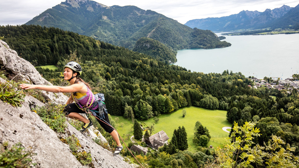 Ist man einmal beim Plombergstein (830 m), muss man diese fantastische Kantenroute einfach machen. Der Anstieg führt in fünf Seillängen, teilweise recht ausgesetzt, entlang einer markanten Felskante bis ganz hinauf zum Gipfel. Die Kletterei ist abwechslungsreich: Gleich zu Beginn wartet eine schöne Platte, später folgt als unvergessliches Highlight ein Spreizschritt über einen Spalt – am besten nicht zu tief ansetzen. Dank der sehr guten Bohrhakenabsicherung eignet sich die Route auch hervorragend für Mehrseillängeneinsteiger*innen. Vom Gipfelbankerl direkt am Ende der Tour genießt man einen unschlagbaren Blick über den Wolfgangsee.