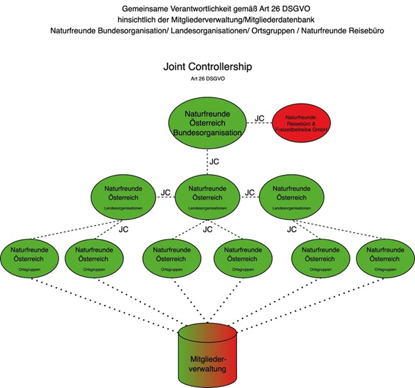Die Naturfreunde Österreich Bundesorganisation, die Naturfreunde Reisebüro und Freizeitbetriebe GmbH, die neun Landesorganisationen sowie die Ortsgruppen der Naturfreunde Österreich sind im Hinblick auf die Verarbeitung personenbezogener Mitgliederdaten in der zentralen Mitgliederdatenbank „Sonnline“ gemeinsam Verantwortliche gemäß Art 26 DSGVO.
