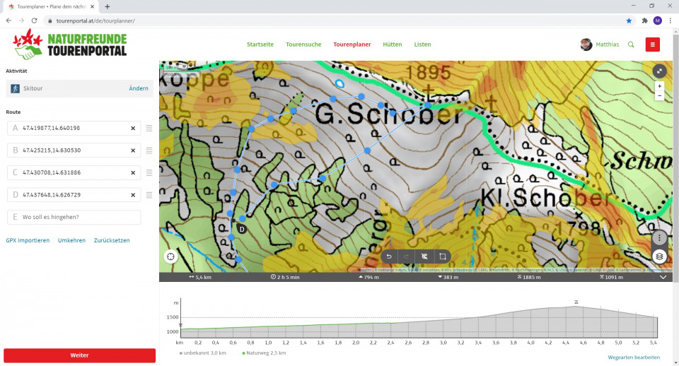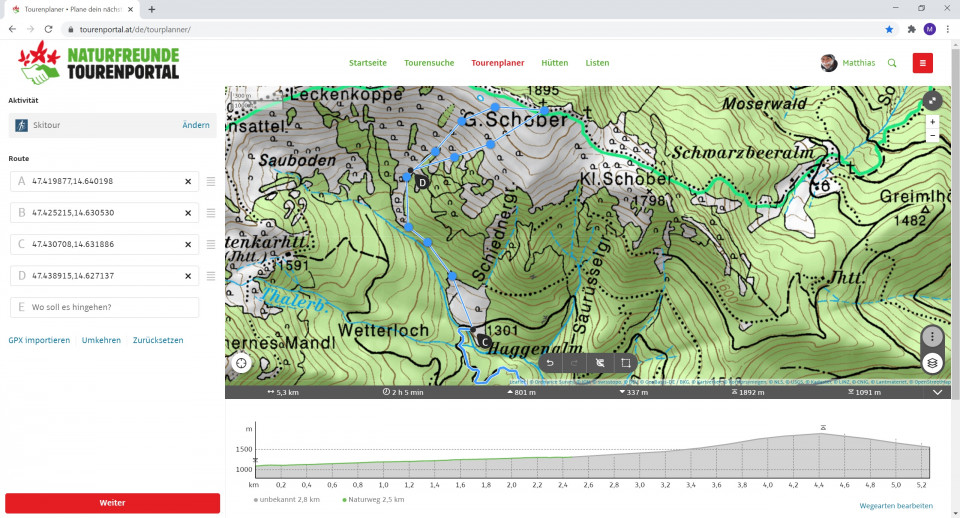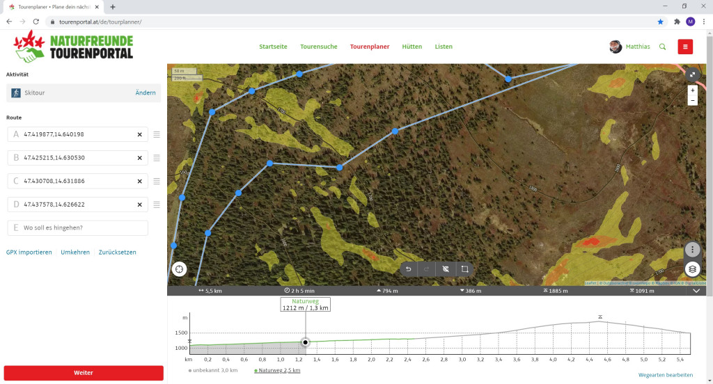00:06:05 – Mit meinem PRO-Account zeichne ich auf dem Tourenportal der Naturfreunde tourenportal.at auf Basis der ÖK-Karte (im Tourenportal „Topo“) rasch die Route aus dem Schitourenbuch ab. Für den Forststraßenteil verwende ich das automatische Routing (Magnet), ab der Haggenalm schalte ich die Funktion aus und zeichne selbst weiter. Auf die Details achte ich noch nicht.