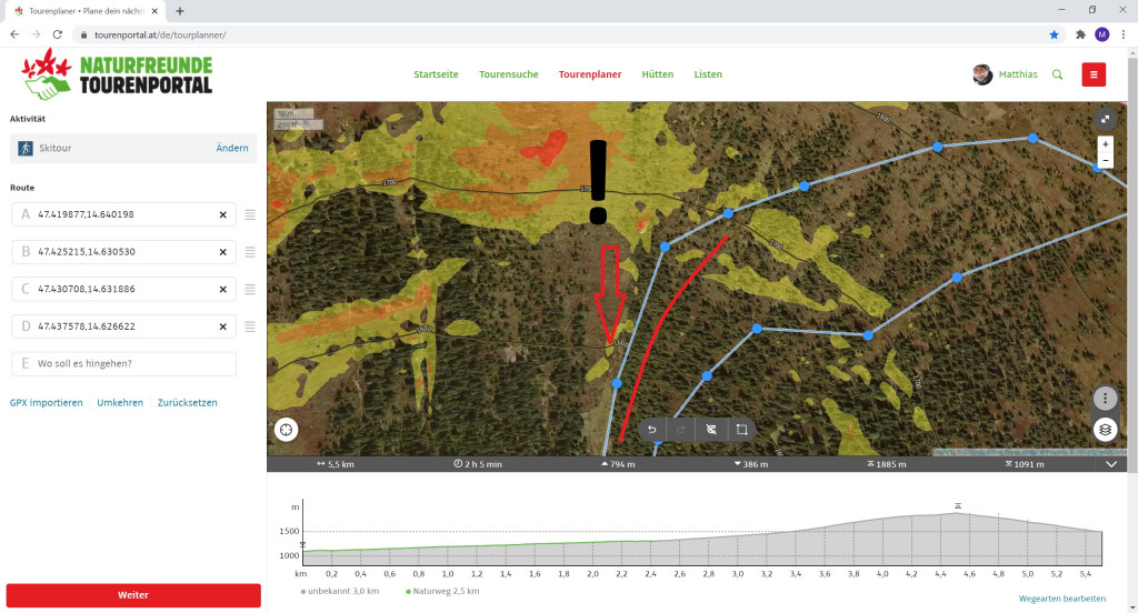 Eine Schitour in einer solchen kurzen Zeitspanne zu planen ist Einsteigerinnen und Einsteigern sowie weniger Geübten wahrscheinlich nicht möglich. Ich wollte mit der 15-Minuten-Planung nur plakativ zeigen, mit wie wenig Aufwand eine Tourenvorbereitung in verhältnismäßig kurzer Zeit und sehr hoher Qualität gelingen kann. Während der Tourenplanung kann es übrigens durchaus passieren, dass man die ins Auge gefasste Tour wegen der Lawinensituation oder anderen Gegebenheiten verwerfen und eine Alternativtour planen muss.