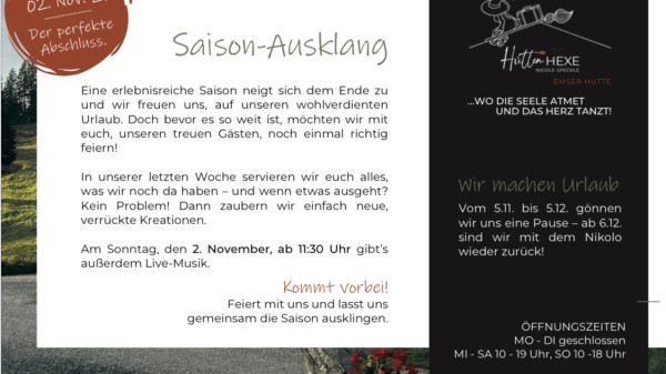 Bis 2.11. ist die Hütte noch geöffnet. Dann macht die Hüttenhexe Urlaub und ist am 6.12. wieder für euch mit allerlei Köstlichkeiten da.