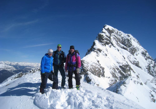 Von hier aus gestaltete sich der Aufstieg recht anspruchsvoll über das immer steiler werdende Gelände. Über den ebenso recht steilen nördlichen Gipfelgrat, bei dem Harscheisen von Vorteil waren, wandern wir nun bis zum Gipfel. In 2 Stunden waren die 850 Höhenmeter geschafft. Am dritten Tag machte sich bei manchen (verständlicherweise) auch eine gewisse Müdigkeit in den Beinen bemerkbar, die bei der Abfahrt, teils durch den Wald und zum Schluss die Forststraße entlang deutlich spürbar war.