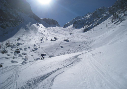 Der zweite Tag trennte unsere Gruppen. Zwei Gruppen hatten sich das Spitzköfele mit einer Höhe von 2.315 m zum Tagesziel gesetzt. Bei strahlendem Sonnenschein führte der erste Teil des Anstieges durch das Rollertal und konnte als leicht bezeichnet werden. Ab der Bödenalm führte uns ein Almweg weiter zur Karalm, wo das Gelände immer steiler wurde. Die Aufstiegsspur wurde von unserem Tourenführer frisch gespurt. Über den steilen Osthang ging es weiter bis auf den Grat und von hier bestiegen wir zu Fuß den Gipfel des Spitzköfele. Hier bestaunten beide Gruppen, nach ~ 1.050 hm Aufstieg und einer Gehzeit von ca. 3 Stunden, freudig die ihnen noch eher unbekannte Bergwelt Osttirols. Die Abfahrt erfolgte östlich des Gipfels nach der Aufstiegsspur und belohnte die Teilnehmer stellenweise auch mit Pulverschnee.