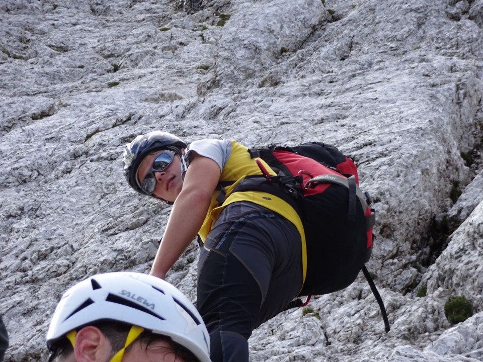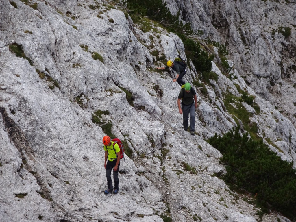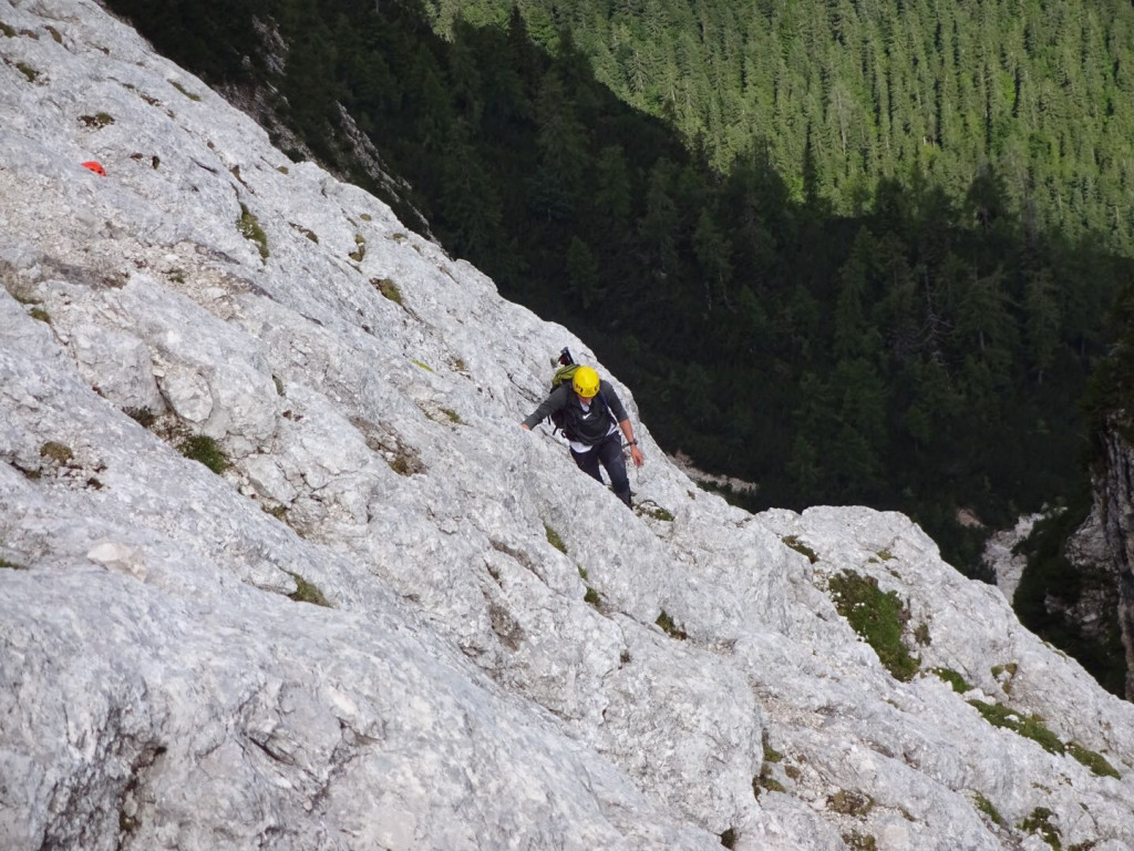 Die Wand selbst war eine sehr schöne Kletterei im 2.-3. Schwierigkeitsgrad und zog sich kontinuierlich nach links hinaus. Nach einer kurzen Schrecksekunden stiegen wir wieder aus der Wand hinaus und stießen dabei wider auf den Normalweg.