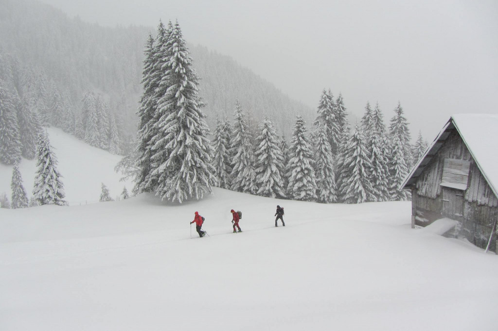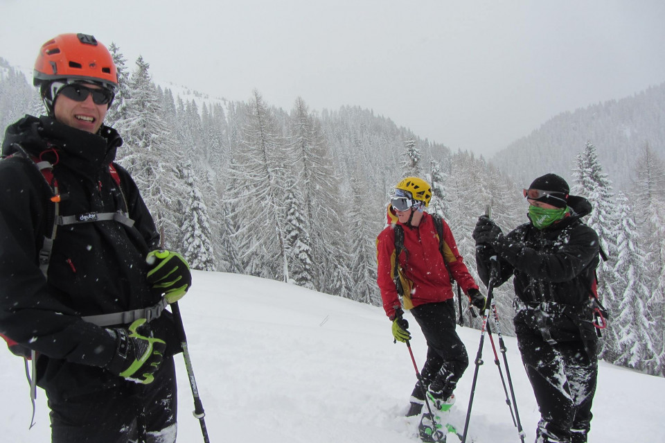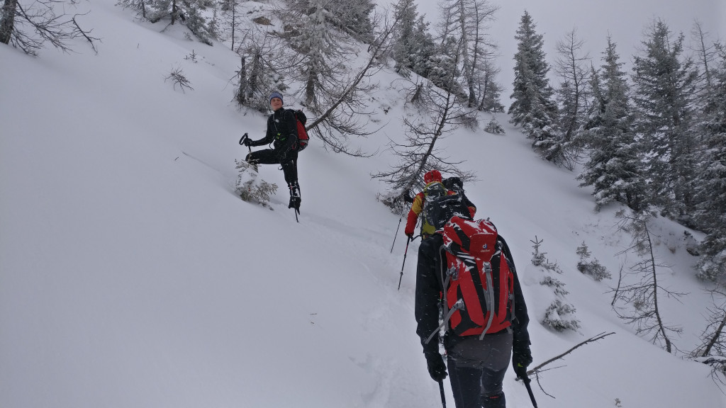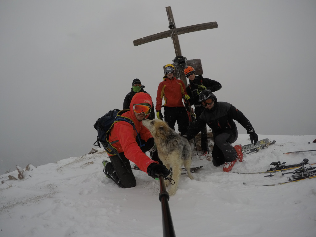 Nach ca. einer halben Stunde erreichten wir zahlreiche große freie Almflächen über welche wir stetig aufstiegen. Es dauerte nicht lange, bis wir einen Sattel erreichten an dem wir durch aufsteigende Spitzkehren den Gipfel erreichten. Der Neuschnee legte sich in einer ca. 50 cm Schicht auf den Altschnee ab. Das war einer der Gründe weshalb wir uns sehr auf die Abfahrt freuten. Ein weiterer war, dass kaum jemand vor uns am Gipfel war und uns allerlei unverspurte Hänge zur Verfügung standen.
