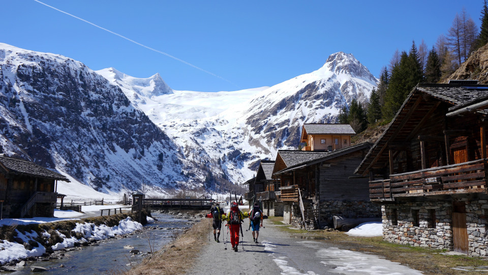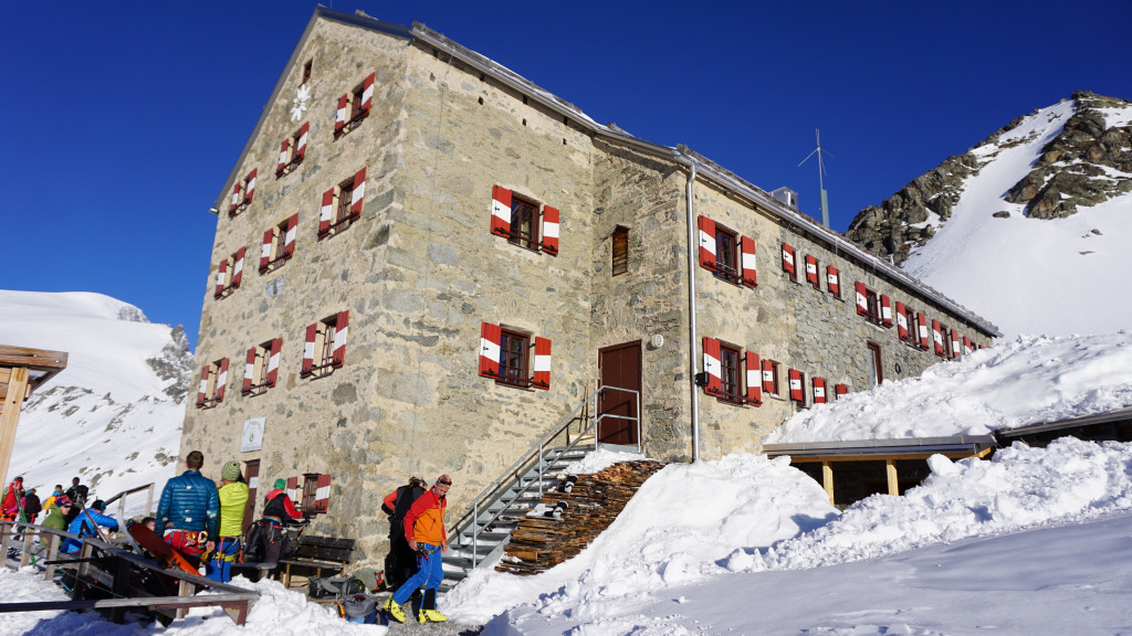 Wegen des Schneemangels, mussten wir ca. 1 Stunde lang die Skier tragen bis hin zur Innergschlöß.  Dort konnten wir endlich mit unseren Skiern an den Füßen weiter gehen. Fünfzehn Minuten später ging es dann steil über den Gletscherrundweg rauf bis auf ein Platon, wo wir kurz rasteten und dann wieder weiter gingen in Richtung Neuer Prager Hütte.