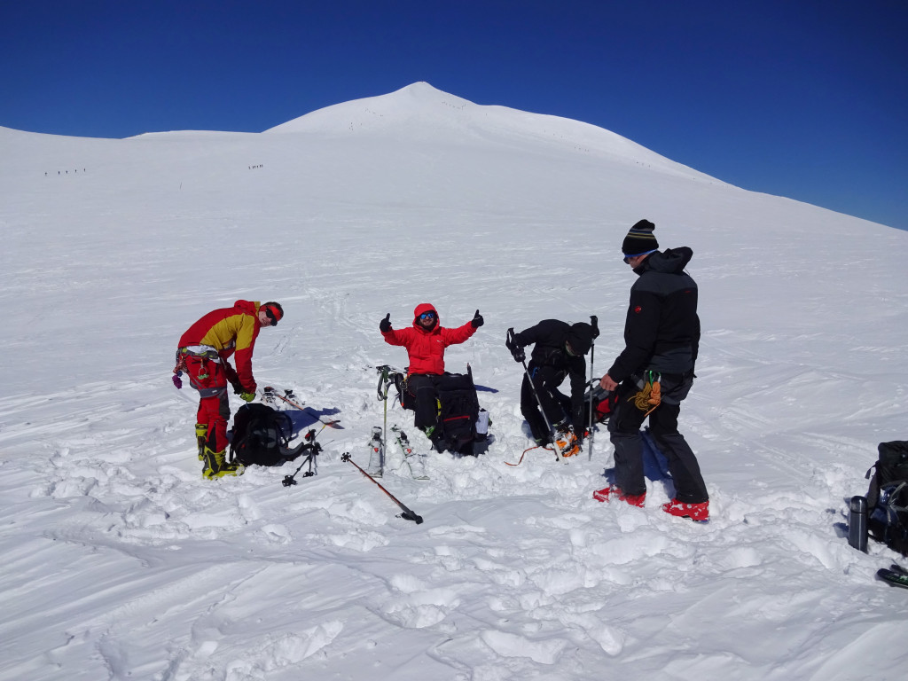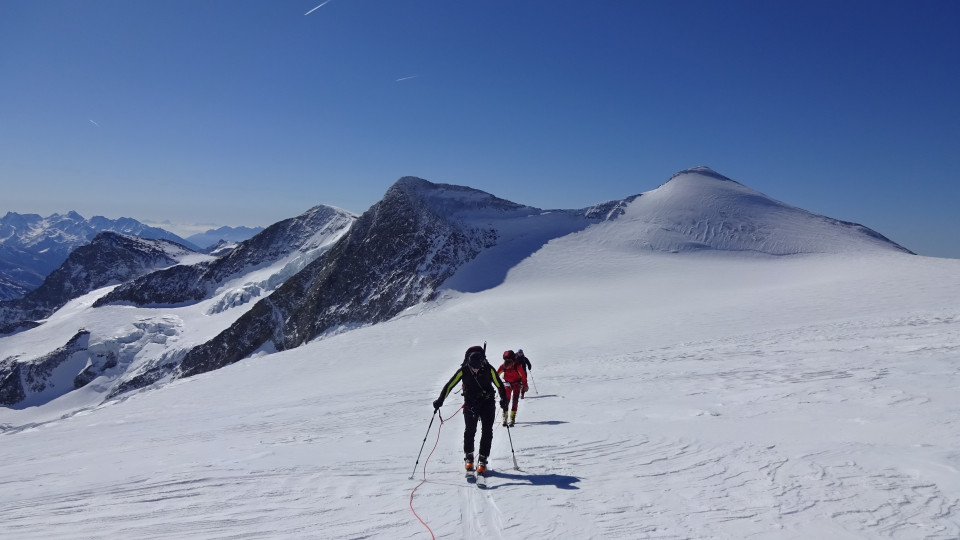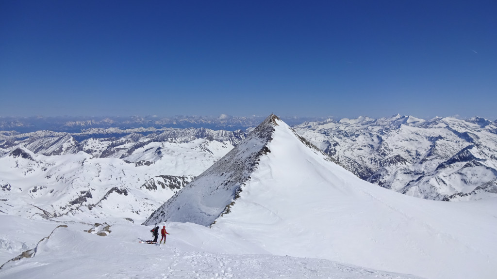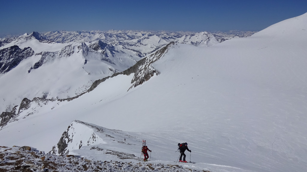 Nach ca. einer halben Stunde erreichten wir den letzten Gipfel. Danach fuhren wir zum Hohen Zaun (3457 Meter) ab, bei herrlichen Firn, dann das letzte Mal auf Fellen und nach ca. 20 Minuten erreichten wir den Gipfel des Hohen Zauns, wo wir eine längere Pause machten bevor wir zur Abfahrt aufbrachen.