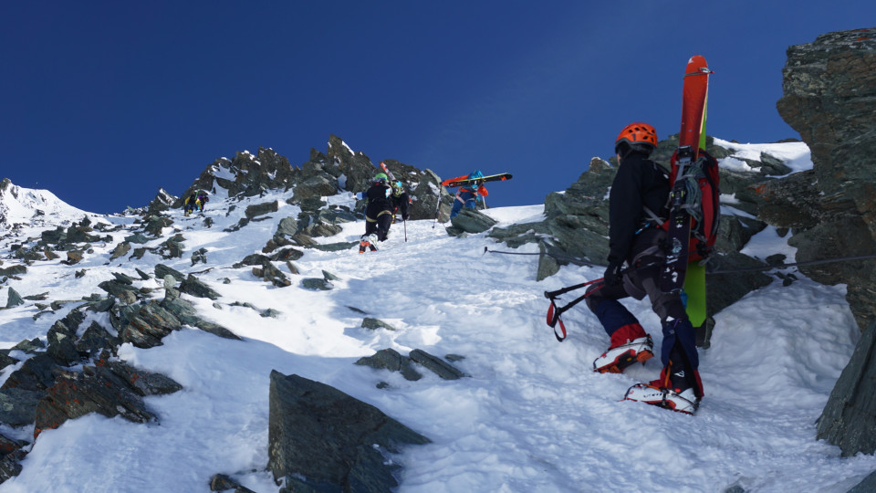 Im Ködnitzkees angekommen, entschieden wir uns zum Klettersteig der Adlersruhe zu Queren, denn die Bedingungen im steilen Kees waren sehr hart Dort angekommen, legten wir unsere Steigeisen an und packten unsere Skier auf den Rucksack.