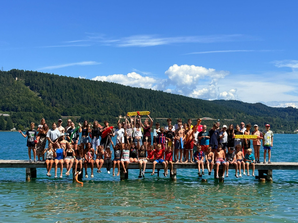 Neben dem Badespaß im Wörthersee standen Stand-Up-Paddeln und Fahrten mit dem Ringo-Boot am Programm. Das großzügige Gelände mit Fußball- und Volleyballplatz bot reichlich Platz für Bewegung, während der angrenzende Wald nicht nur als Erholungsraum genutzt wurde, sondern auch durch waldpädagogische Elemente in das Camp-Programm einfloss.